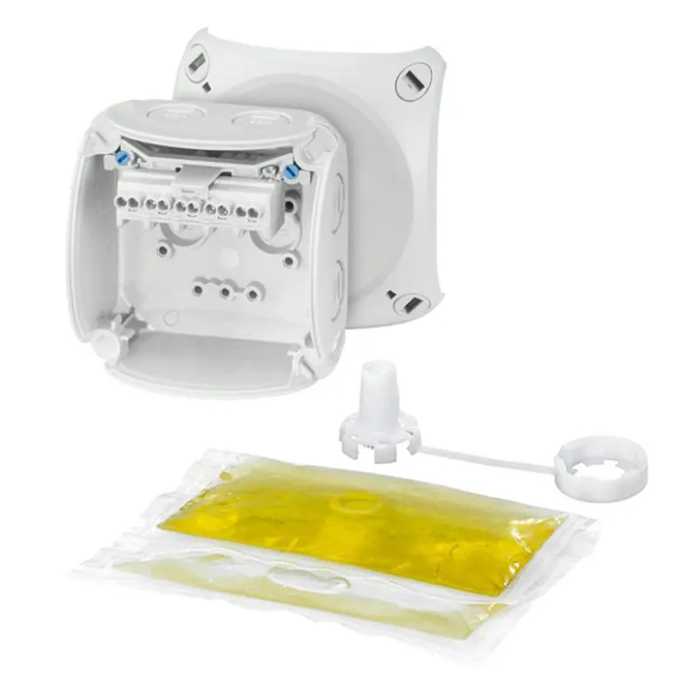 Kytkentärasia harmaata polykarbonaattia, kaksikomponenttinen geeli. Kun geeli on kovettunut, rasiasta tulee täysin vedenpitävä ja se mahtuu alttiisiin ympäristöihin.