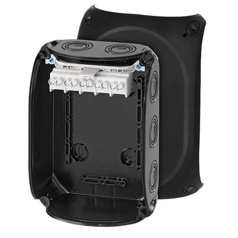 Kytkentärasia lasikuituvahvistettua polykarbonaattia vaativiin ympäristöihin asennettavaksi. Nimellisjännite 690V. Hyvä UV-kestävyys. Laatikossa on 5-napainen liitin kaapeleille Toimitetaan läpivientiaukkoineen ja aukoilla erikseen tilattaville ruuviliittimille. Laatikot ovat Länsförsäkringarin suosittelemia käytettäväksi maatalouskäyttöön.Kansissa on pikalukitus ja näkyvä lukitusasento. Monivaiheiset läpivientiaukot erikokoisille kaapelikiinnikkeilleja myös kaapeliläpivienti pohjassa Kaikki liittimet kahdella kiinnikkeellä napaa kohden, jotka voidaan asettaa eri liitinasentoihin ja eri kiinnitysvaihtoehdoilla. Korotetut liittimet, joissa on runsaasti tilaa liitännöille sekä kyky liittää eri johdinkokoja ja kaapelityyppejä. Laatikon mukana toimitetaan aina ulommat liittimet