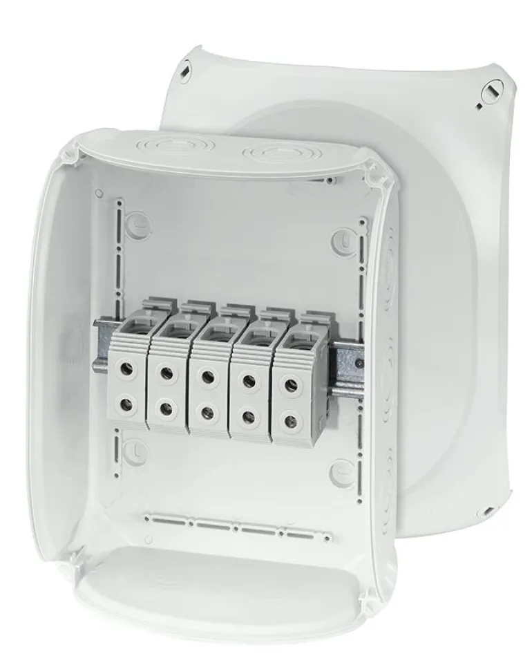 Kytkentärasia, jossa on liitin. Kannessa on pikalukitus ja näkyvä lukitusasento. Monivaiheiset läpivientiaukot erikokoisille kaapelikiinnikkeilleja myös kaapeliläpivienti pohjassa Kaikki liittimet kahdella kiinnikkeellä napaa kohden, jotka voidaan asettaa eri liitinasentoihin ja eri kiinnitysvaihtoehdoilla. Korotetut liittimet, joissa on runsaasti tilaa liitännöille sekä kyky liittää eri johdinkokoja ja kaapelityyppejä Laatikon mukana toimitetaan aina ulkoiset kiinnittimet.
