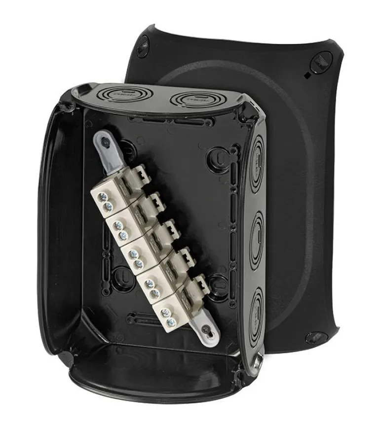 Kytkentärasia lasikuituvahvistettua polykarbonaattia vaativiin ympäristöihin asennettavaksi. Nimellisjännite 690V. Hyvä UV-kestävyys. Laatikossa on 5-napainen liitin kaapeleille Toimitetaan läpivientiaukkoineen ja aukoilla erikseen tilattaville ruuviliittimille. Laatikot ovat Länsförsäkringarin suosittelemia käytettäväksi maatalouskäyttöön.Kansissa on pikalukitus ja näkyvä lukitusasento. Monivaiheiset läpivientiaukot erikokoisille kaapelikiinnikkeilleja myös kaapeliläpivienti pohjassa Kaikki liittimet kahdella kiinnikkeellä napaa kohden, jotka voidaan asettaa eri liitinasentoihin ja eri kiinnitysvaihtoehdoilla. Korotetut liittimet, joissa on runsaasti tilaa liitännöille sekä kyky liittää eri johdinkokoja ja kaapelityyppejä. Laatikon mukana toimitetaan aina ulommat liittimet