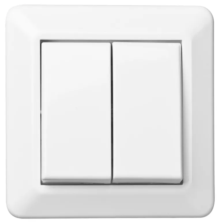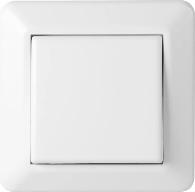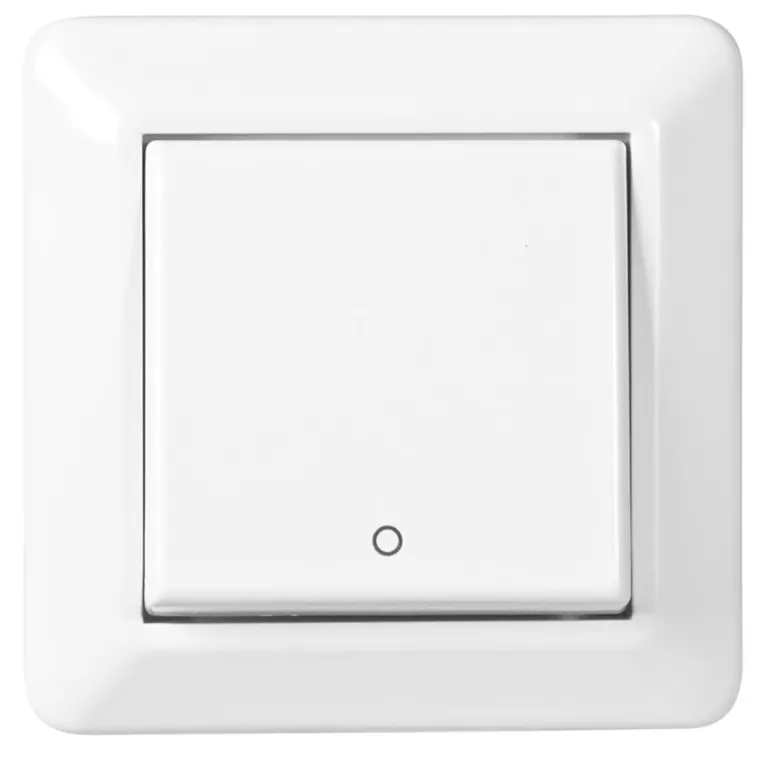 Valkoinen uppoasennettava kytkin, jonka pohja, painikkeet ja kehys on halogeenittomasta kestomuovista. Painettavalla kehyksellä.