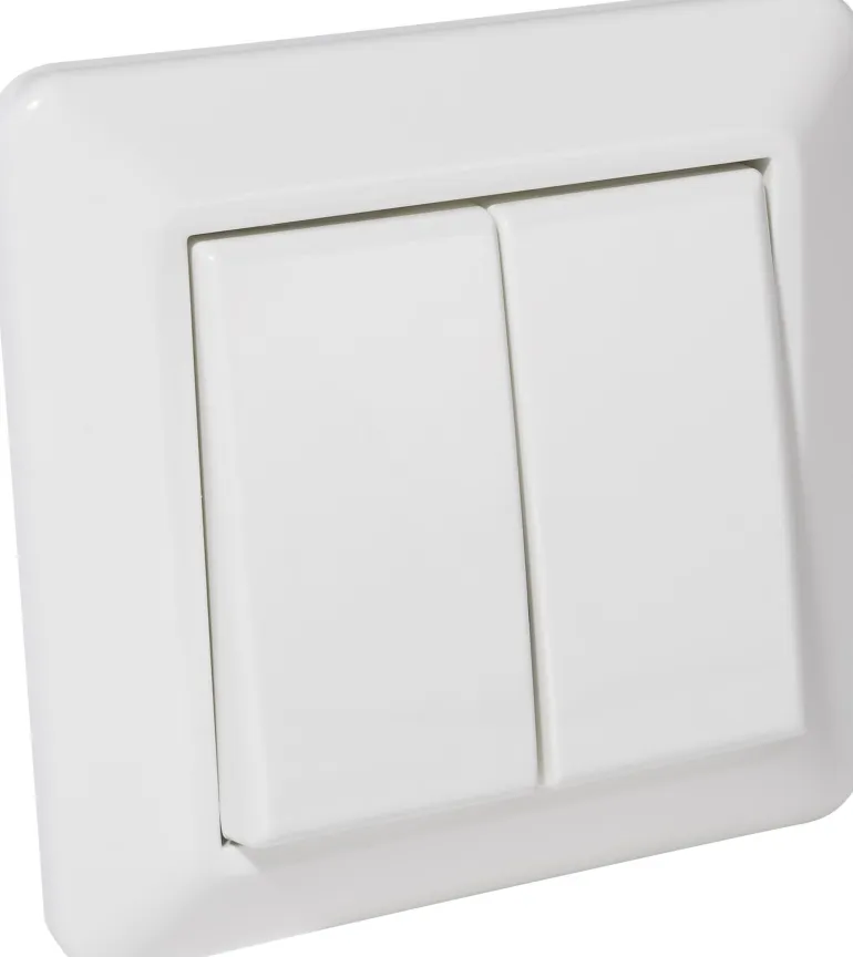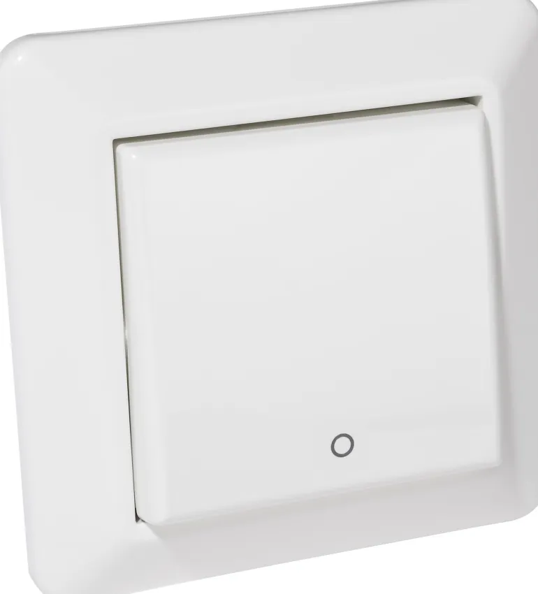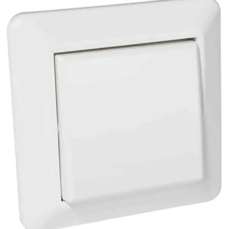 Kytkin uppoasennukseen, kytkintyyppi 1-napainen/portaikko ja nimellisjännite 250 V. Kytkintä käytetään keinuvivulla/painikkeella.