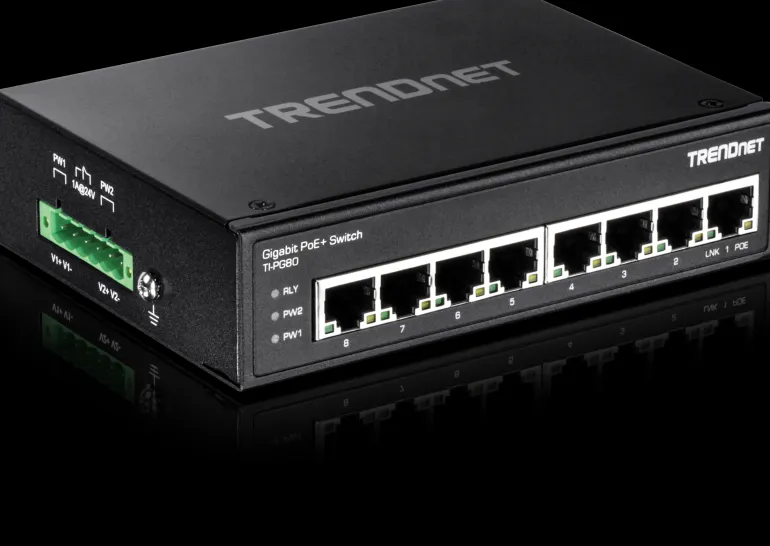Industry Switch 8xGb portit PoE+ 30W (ja PoE 15,4 W). Sisältää DIN- ja seinäkiinnikkeet. IP30, 8KV ESD-suojaus, 6 KV purkautumissuoja. Lämpötila-alue -40…+75ºC, lisäverkkoliitännät, maadoitusruuvi. Virtalähde hankittava erikseen. Jännite 48–56 V DC. Virrankulutus enintään 5,76W. 3 vuoden takuu. Pakkauksessa: TI-PG80, asennusohje, irrotettava liitinlohko, DIN-kisko-/ seinäasennussarja.