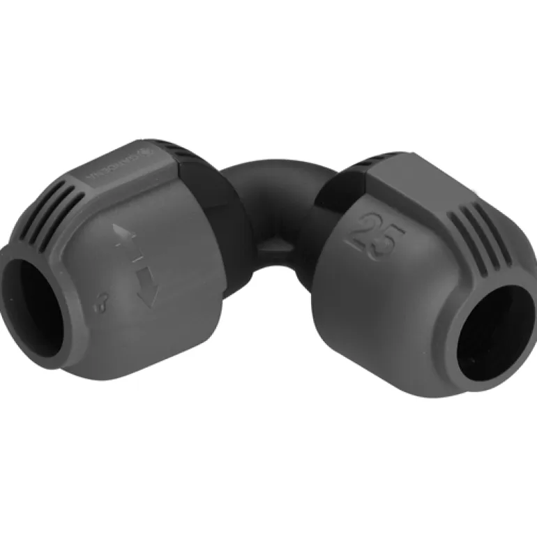 25 mm:n L-liitin on osa GARDENA-sadetinjärjestelmää, ja sitä käytetään runkoputken suunnan muuttamiseen. Patentoidun Quick & Easy -liitostekniikan ansiosta putkisto voidaan koota ilman työkaluja.