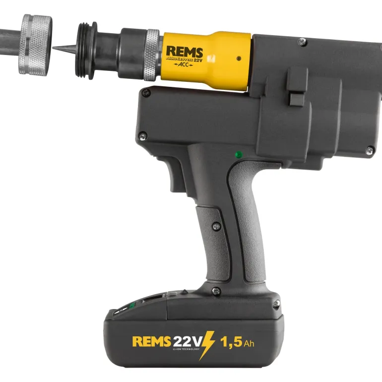 REMS Akku-Ex-Press Cu 22 V ACC on 21,6 V:n putken laajennustyökalu, Cu. Putken laajennustyökalu sopii kupariputkien nopeaan laajennukseen Ø 8 – 42 mm, sähköhydraulinen käyttö automaattisella palautuksella. REMS Akku-Ex-Press Cu 22 V ACC on varustettu tehokkaalla akkukäyttöisellä moottorilla, jonka teho on 380 W, kestävällä planeettavaihteella, epäkeskomäntäpumpulla ja kompaktilla korkean suorituskyvyn hydrauliikkajärjestelmällä.