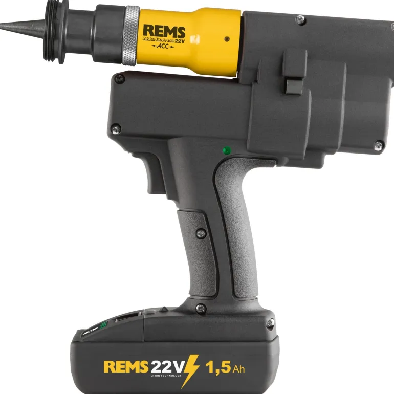 REMS Akku-Ex-Press P 22 V ACC on 21,6 V putken laajennustyökalu muoviputkien ja metallisisäosalla varustettujen muoviputkien nopean laajentamiseen Ø 12 – 40 mm. Sähköhydraulinen käyttö, automaattinen palautus, tehokas akkukäyttöinen moottori 21,6 V, teho 380 W, kestävä planeettavaihteisto, epäkeskomäntäpumppu ja kompakti korkean hyötysuhteen hydrauliikkajärjestelmä.