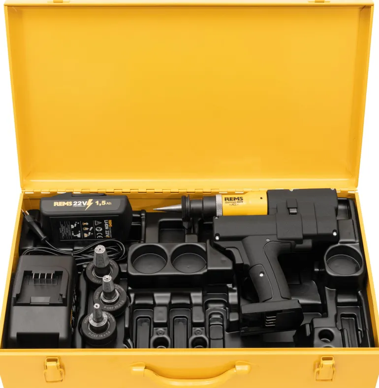 Akkukäyttöinen putken laajennustyökalu, 20 kN, automaattisella paluulla (ACC), muoviputkien nopeaan laajentamiseen Ø16 – 40 mm. Sähköhydraulinen käyttö, automaattinen palautus, tehokas akkukäyttöinen moottori 21,6 V, teho 380 W, LED-työvalaisin, kestävä planeettavaihteisto, epäkeskomäntäpumppu ja kompakti korkean hyötysuhteen hydrauliikkajärjestelmä. Turvakytkin. Laajennuslaite P-CEF REMS-laajennuspäiden P-CEF ja sopivien muiden valmistajien laajennuspäiden kiinnittämiseen. Akku- ja verkkovirtakäyttöinen (verkkovirtasovitin ei sisälly toimitukseen). Voidaan käyttää missä tahansa, vapaalla kädellä, pään korkeuden yläpuolella, erityisesti ahtaissa tiloissa. Optimaalinen painojakauma yhden käden käyttöön.
