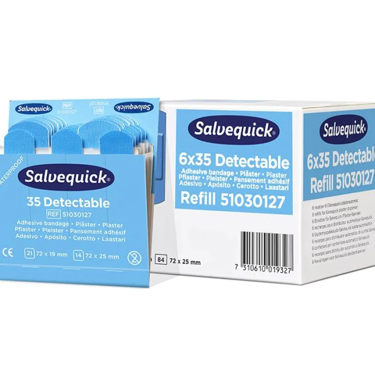 Salvequick 51030127 Blue Detectable on allergiatestattuja sinisiä laastareita, jotka on erityisesti suunniteltu käytettäväksi elintarviketeollisuudessa, koska ne ovat havaittavissa useimmilla metallinpaljastimilla ja helposti löydettävissä visuaalisesti.
