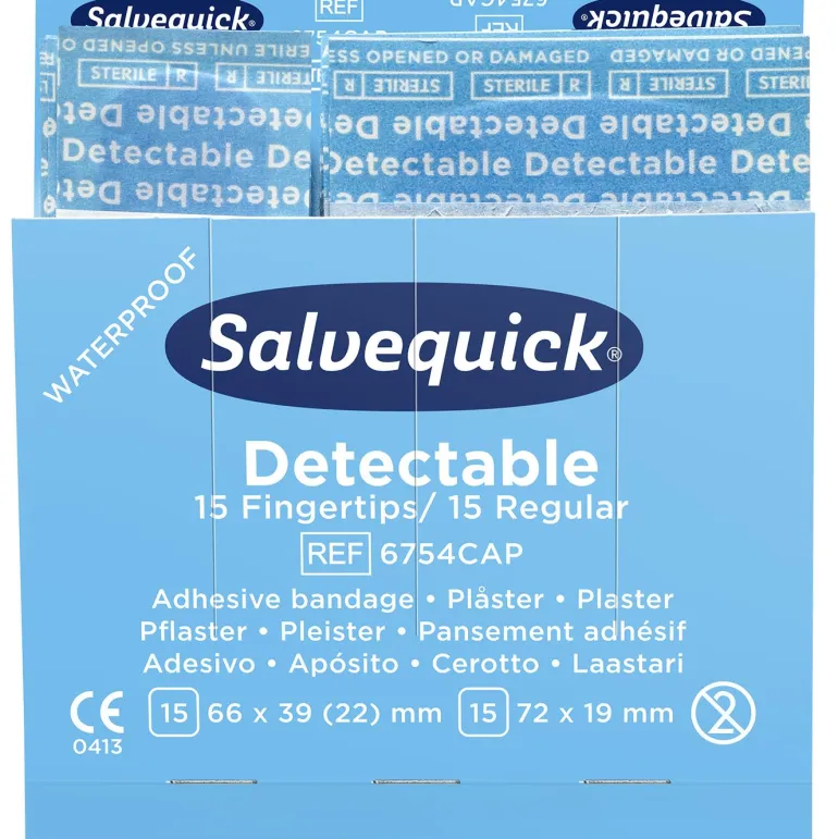 Salvequick 51030126 Blue Detectable -pakkaus sisältää 30 laastaria, jotka on tarkoitettu erityisesti elintarviketeollisuuskäyttöön. Laastarit on helppo havaita ja jäljittää useimmilla metallinpaljastimilla. Siniset laastarit on helppo nähdä. Laastarit ovat allergiatestattuja. Helppo laittaa paikalleen, joustavat ja kätevät käytössä. Lisäksi ne kestävät vettä.