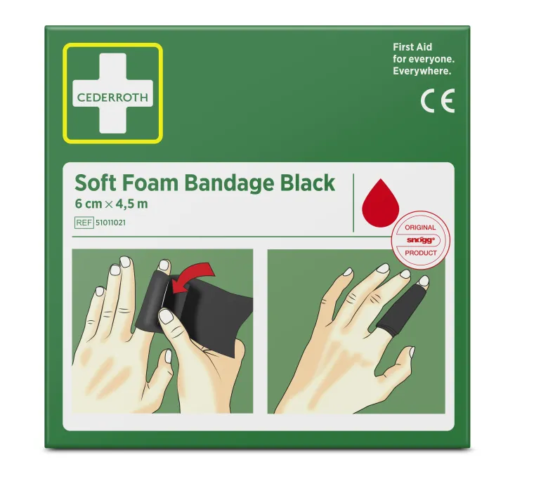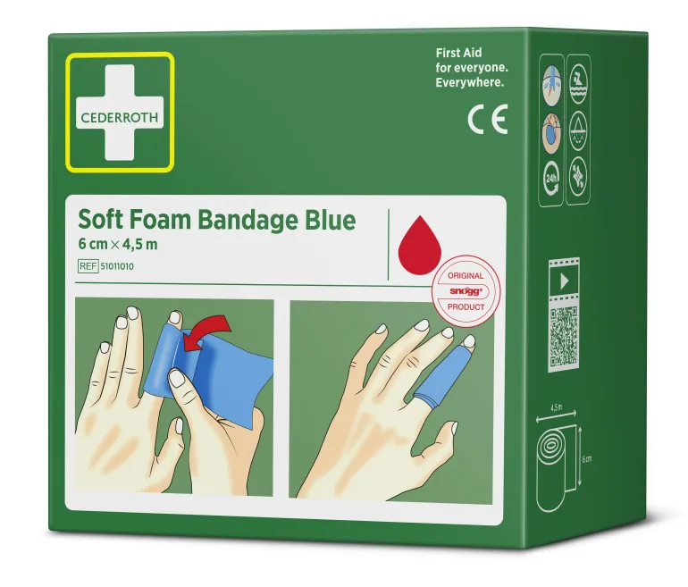 Soft Foam Bandage on itsekiinnittyvä liimaton laastari, joka ei takerru ihoon tai hiuksiin. Repäise sopiva palanen ja kiedo vammakohtaan. Jos verenvuoto on voimakasta, tee Soft Foam Bandagesta ”tyyny”, joka toimii painesiteenä. Cederroth Soft Foam Bandage on ihanteellinen nopeaan ja helppoon haavanhoitoon. Sininen väri erottuu hyvin, ja laastari sopii käytettäväksi elintarvikkeita käsiteltäessä. Soveltuu täyttöpakkaukseksi Wound Care Dispenser- tai Soft Foam Bandage Dispenser annostelijaan. Lateksiton.