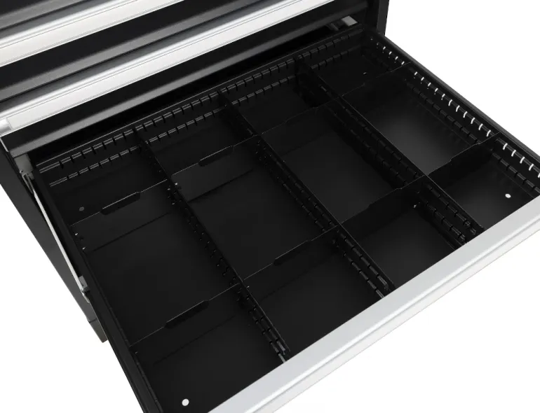 Vankka työkalulaatikosto, jossa on 14 ulosvedettävää laatikkoa (kapasiteetti 75 kg per laatikko). Mustaksi lakattu pinta ja hopeanväriset yksityiskohdat.