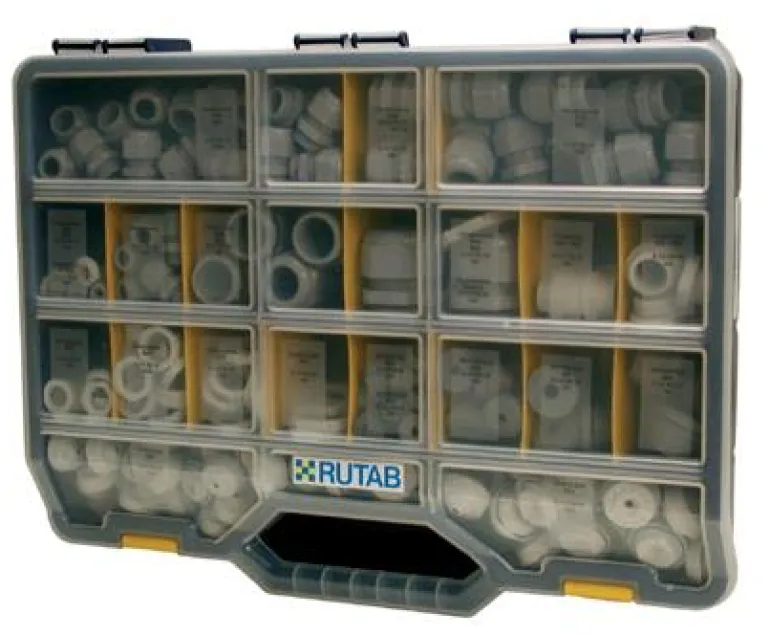 Lajitelmalaatikko sisältää yleisimmät muovi-/kumituotteet tavallisiin asennuksiin. Muovilaatikon eri lokeroihin on selvästi merkitty E-numero ja tyyppi; Kumiset läpiviennit RUTASEAL® M12–M32.