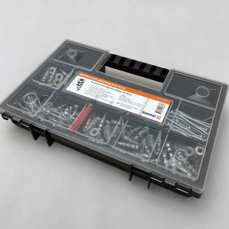 Levytulppa Sormat KLA muovirasiassa. Kipsiseiniin itseporautuva metallinen pikakiinnitin. Sisältää 200 tulppaa ja 35 mm sekä 50 mm upporuuvit.