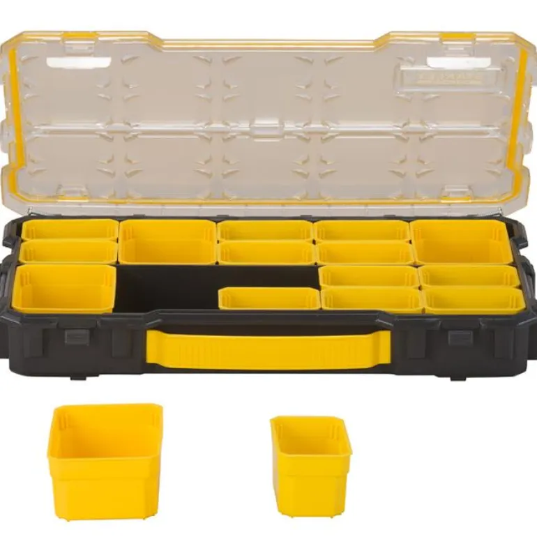 Lajittelulaatikko 16 lokerolla (12 pientä ja 4 keskikokoista), yhteensopiva Pro-tuoteperheen kanssa – voidaan asentaa turvallisesti muihin Pro-valikoiman moduuleihin. Kestävä, täysin läpinäkyvä PC-kansi mahdollistaa sisällön esteettömän näkyvyyden ja helpon saatavuuden. Pinottava laatikko – jopa 9 tuotetta voidaan pinota päällekkäin. Joustava ja monipuolinen – eri tuotekokoja ja -malleja, jotka ovat yhdisteltävissä keskenään. Pölyn- ja vedenkestävä malli on turvallinen vaihtoehto myös ulkokäyttöön. Sivuilla olevat lukot helpottavat pinontaa ja kuljetusta. Kuuden irrotettavan ja siirrettävän laatikon ansiosta voit helposti luoda käyttötarpeisiisi sopivan järjestelmän. Sisältää yhteenliitettävät tilanjakajat.
