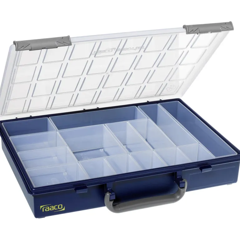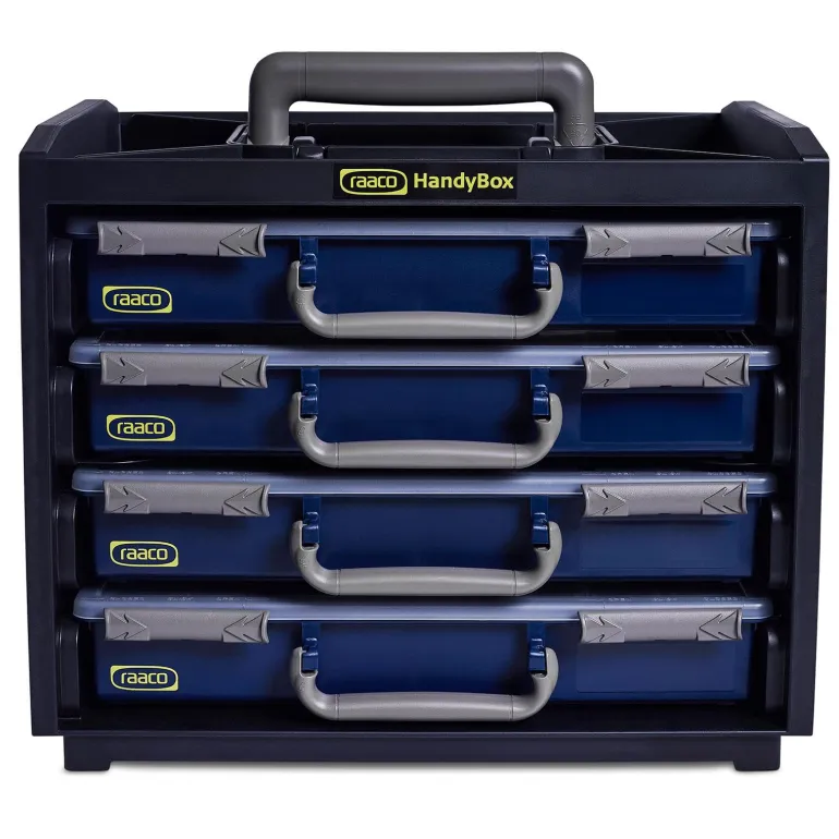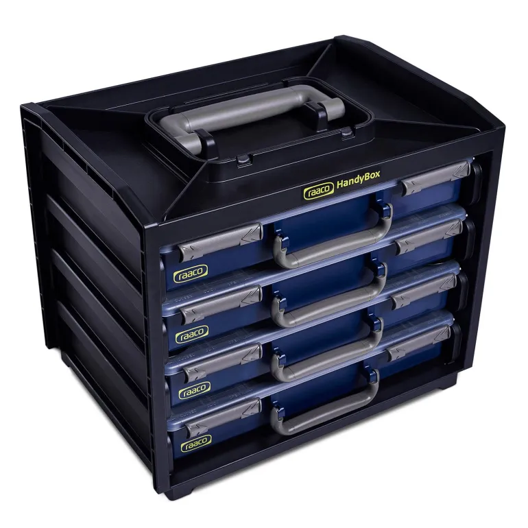 Iskunkestävää muovia. Musta, siniset yksityiskohdat. Laatikoita voidaan pinota, ripustaa tai liittää yhteen. Laatikot pysyvät paikallaan lukituksen ansiosta. Toimituksen sisältö: 2 x PSC4-15 ja 2 x PSC 4-17.