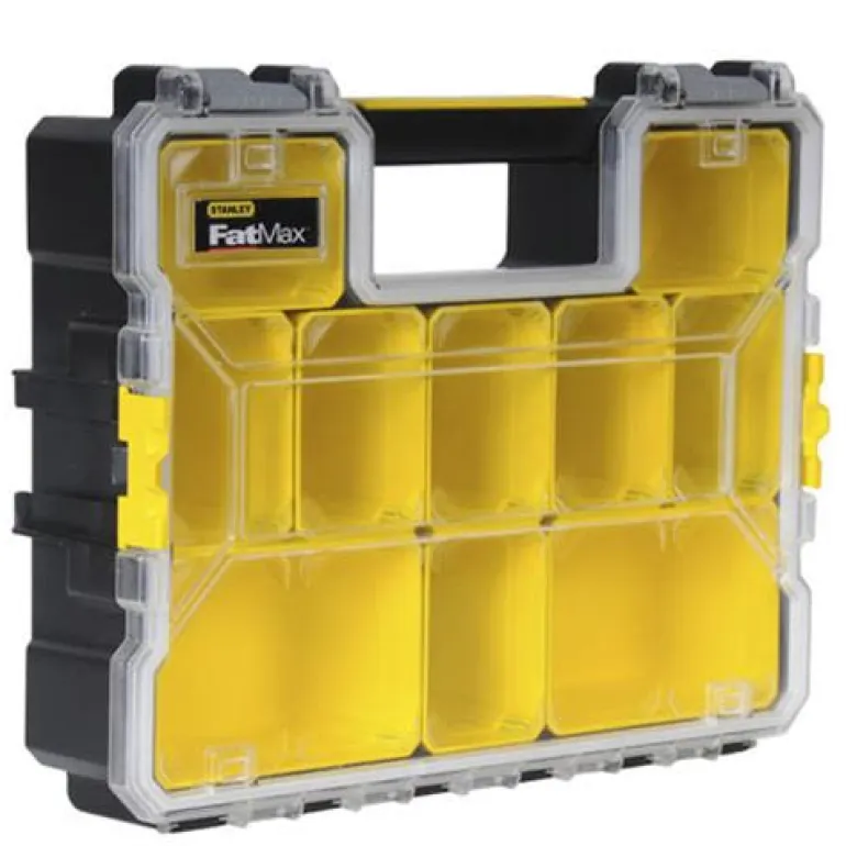 Lajittelulaatikko erikoistukevalla kahvalla ja kiinnittimillä. Kiinteä leveä kahva mahdollistaa helpon ja vakaan kuljetuksen. Irrotettavat lokerot pienten osien ja tarvikkeiden säilyttämiseen. Murtumaton, läpinäkyvä ja iskunkestävä kansi lukitsee tiiviisti kaikki lokerot. Leveät sivukiinnittimet mahdollistavat tukevan pinonnan. Mitat: 44,6 x 11,6 x 35,7 cm.