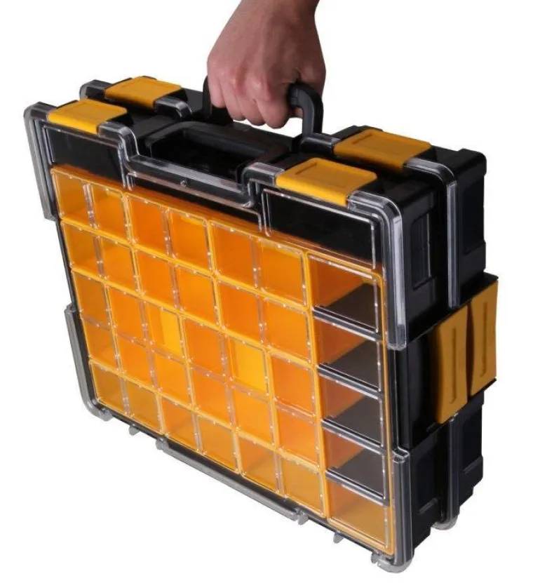 Erittäin tukeva lokerikko läpinäkyvällä polykarbonaattikannella. 14 irrotettavaa sisäosaa ja neljä jakajaa. Laatikko voidaan pinota ja kytkeä lyhyeltä sivulta yhteen. Ergonominen taittuva kahva. Toimitetaan ilman työkaluja.