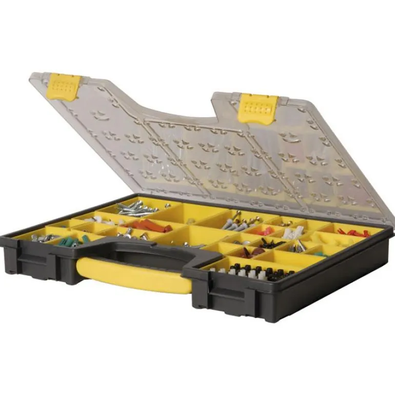 STANLEY 1-92-748 on lajittelulaatikko 25 pienellä säilytyslokerolla ja muotoonvaletulla kahvalla. Iskunkestävä polypropyleenikansi kennorakenteella suojaa sisälokeroita tehokkaasti ja lukitsee lokerot niin, etteivät eri lokeroiden sisällöt pääse sekoittumaan keskenään. Suuri säilytystila usein käytetyille tarvikkeille.