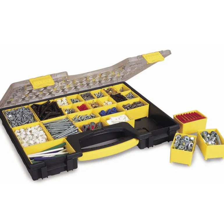 Lajittelulaatikko 25 pienellä säilytyslokerolla ja muotoonvaletulla kahvalla. Lokerot lukitaan lukon avulla niin, etteivät eri lokeroiden sisällöt pääse sekoittumaan keskenään. Suuri säilytystila usein käytetyille tarvikkeille.