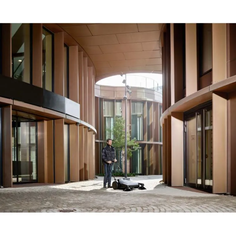 Lakaisukoneen mitat ovat 1 470 x 850 x 1 120 mm (P x L x K) ja se painaa 19,5 kg. Kompaktia ja kevyttä lakaisukonetta voi käyttää myös ahtaissa tiloissa. Ratasjärjestelmä pyörittää harjoja, kun käyttäjä työntää konetta, joten kone on hiljainen. Moottoria ei ole, joten päiväsiivous on mahdollinen ja edullinen vaihtoehto. Koneessa on monenlaisia etuja käyttäjälle, kuten pehmeä kahva, jonka säätövaran ansiosta työasento on aina mukava. Sisäinen suodatin rajoittaa pölyn pääsyä pois roskasäiliöstä, ja suuri roskasäiliö on helppo tyhjentää. Kaiken kaikkiaan tämä Nilfiskin nopea ja tuottoisa lakaisukone on ihanteellinen vaihtoehto esimerkiksi pieniin tehtaisiin, pysäköintialueille, ostoskeskuksiin, kouluihin, pajoihin, linja-auto- ja rautatieasemille sekä toimistojen ulkotiloihin.