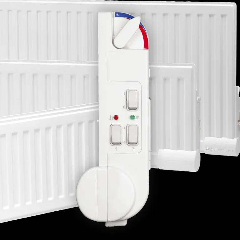 Vakiolämpöpatteri, jonka mitat ovat 500 x 500 mm. Varustettu elektronisella termostaatilla ja automaattiseen lämpötilan alentamiseen perustuvalla energiansäästötoiminnolla.