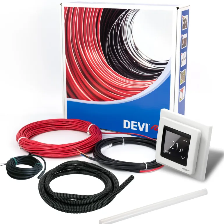 Lämmityskaapelisarja, joka sisältää maalarinvalkoisen elektronisen termostaatin DEVIreg Touch. Lattia-asennukseen, rakennuskorkeus 4 mm. Ympäristöhyväksytty, pituusmerkitty lattia-asennukseen tarkoitettu lämmityskaapeli laattojen, muovimaton, puun tai laminaatin alle rakentamisen tai remontoinnin yhteydessä.