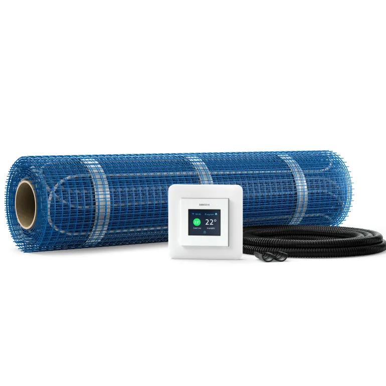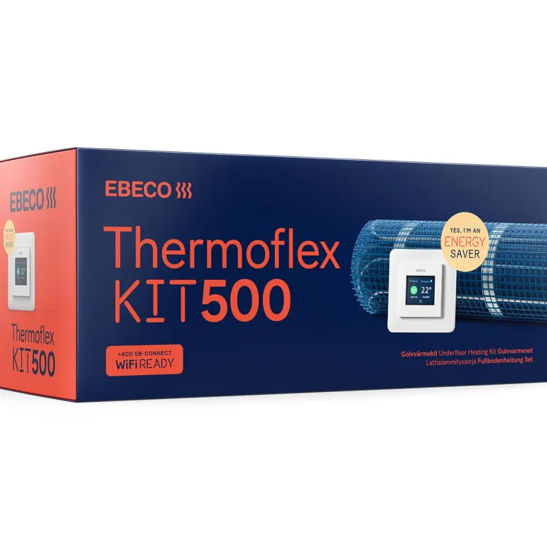 Thermoflex Kit 500 -lattialämmitys sisältää tarramaton, joka on tarkoitettu avoimille ja tasaisille pinnoille. Tuote sisältää myös EB-Therm 500 -termostaatin värinäytöllä ja useilla yksilöllisesti muokattavilla energiansäästöohjelmilla.