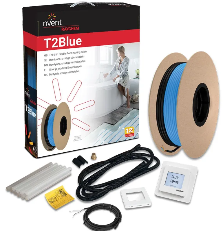 Lattialämmitykseen tarkoitettu lämpökaapelipaketti, jossa on ohut sarjaresistiivinen kaksijohdinkaapeli kelapakkauksessa kiinnitetyllä 2,5 m:n kylmäkaapelilla.