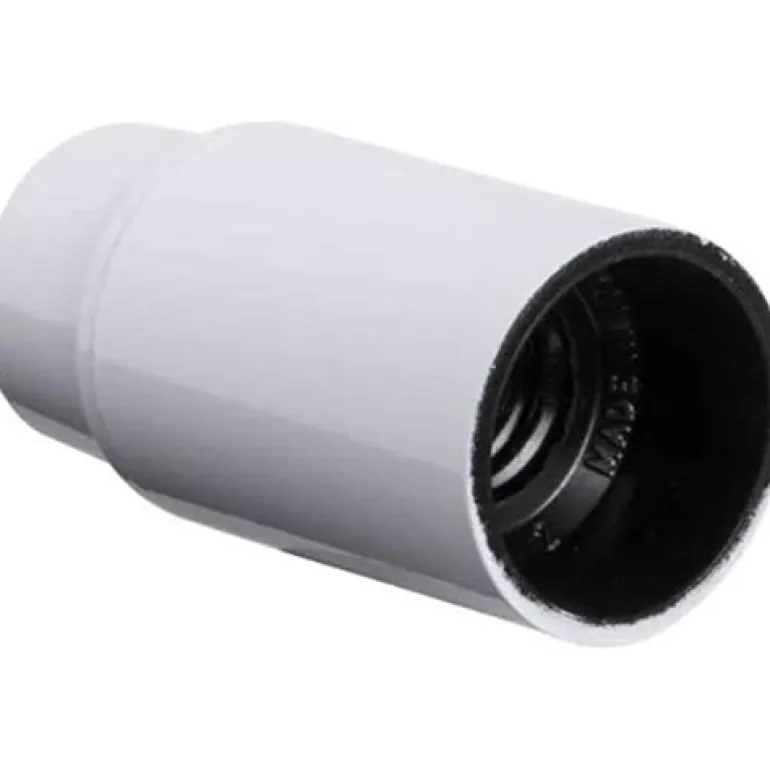 Sileä lampunpidike, jossa on eristyssarja ja jännityksenpoistaja. Pidike soveltuu esimerkiksi pöytä- ja kattovalaisimille. Ilman maapulttia.