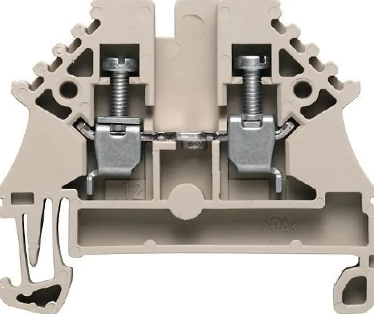 Weidmüller WDU 2.5 -läpivientiliitin Plint W -sarjasta. Kiinnityssanka ja ruuvi on valmistettu teräksestä, kun taas johdinkisko, joka on päällystetty tinaa olevalla lyijykerroksella, on valmistettu kuparista.
