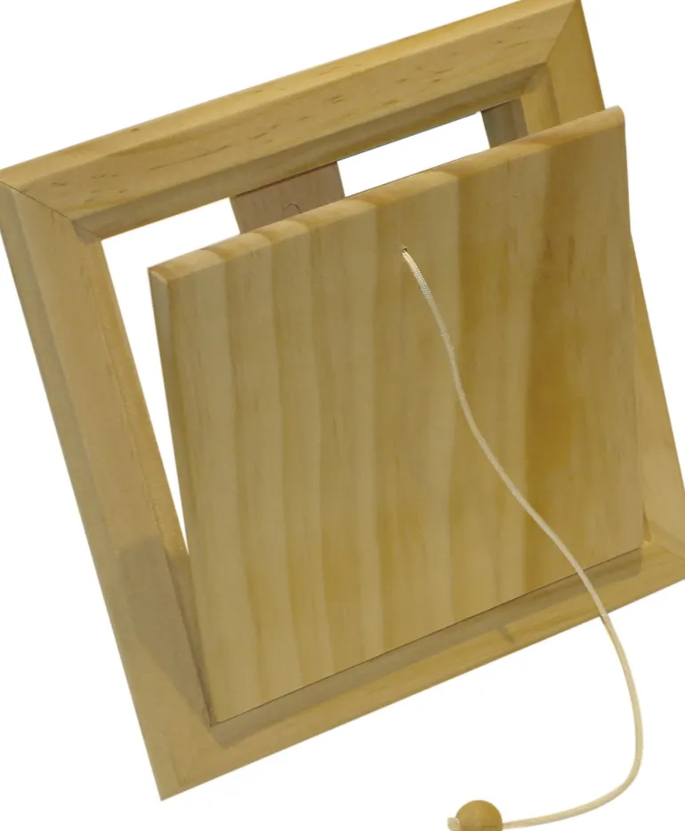 Läppäventtiili puusta, asennettavaksi suoraan seinään, luukussa on sarana alareunassa ja sen voi säätää kolmeen kiinteään asentoon.