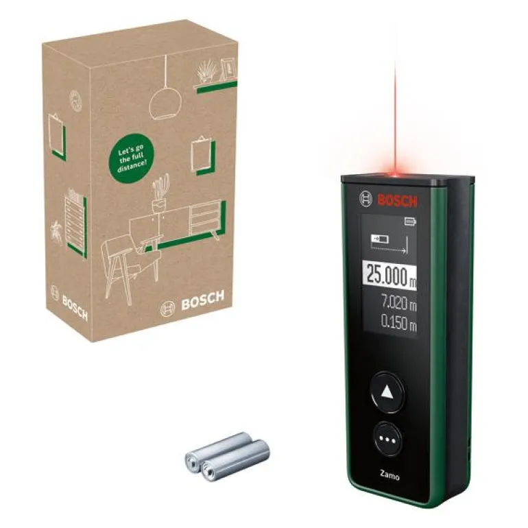 Bosch Zamo-laseretäisyysmittarin avulla on helppo määrittää kalustettavien huoneiden pituudet tai korkeudet tai laskea remonttiin tarvittavat lattiamateriaali- tai maalimäärät. Asetuksen, tähtäyksen ja napin painalluksen jälkeen Zamo mittaa tarkasti jopa 25 metrin etäisyydet ±2 mm/m:n tarkkuudella.