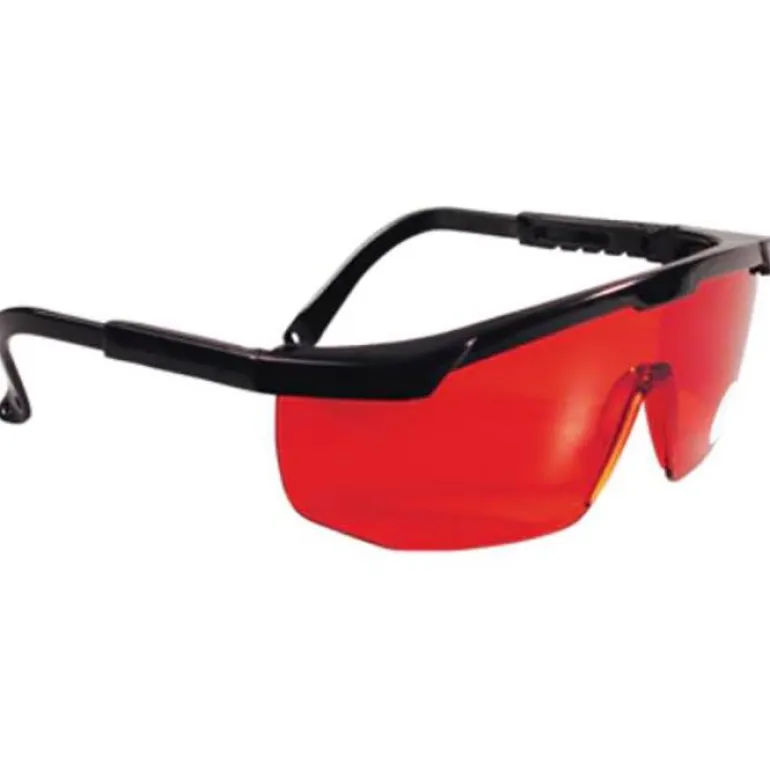 Punaiset muoviset laserlasit. Tärkeää – näitä ei pidä sekoittaa laserSUOJALASEIHIN. Näitä laseja käytetään AINOASTAAN parantamaan säteen näkyvyyttä kirkkaassa valaistuksessa tai kaukana laserlähteestä.