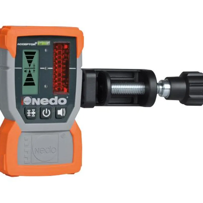Nedo ACCEPTOR2 on laservastaanotin, jossa on Heavy Duty -kiinnitin, joka turvallisesti ja luotettavasti kiinnittää laservastaanottimen, jopa vaikeimmissa käyttöolosuhteissa. Laitteessa on suuri LCD-näyttö edessä ja takana ja kaksi tarkkuustilaa; karkea ja hieno.