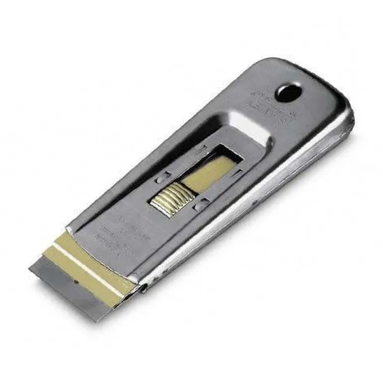 Ammattimainen laadukas lasikaavin, jossa on sisäänvedettävä suorakaiteen muotoinen terä. Kaapimessa on messinkinen painike ja metallikotelo.