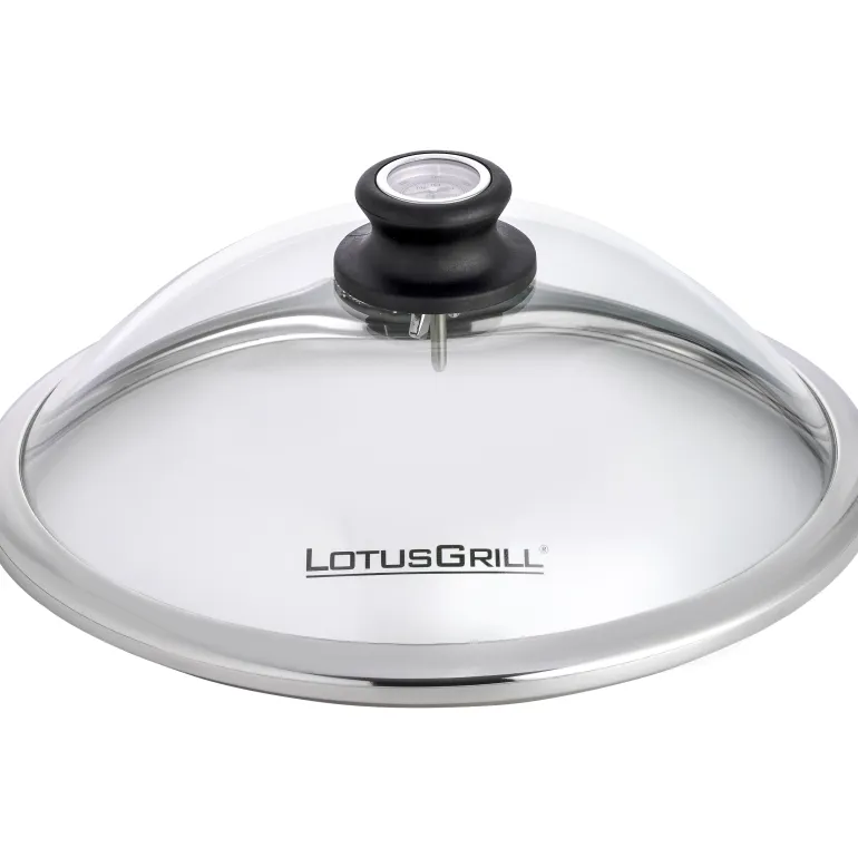 Erikoismuotoiltu lasikansi sisäänrakennetulla lämpömittarilla LotusGrill Small 28 cm -grillille.