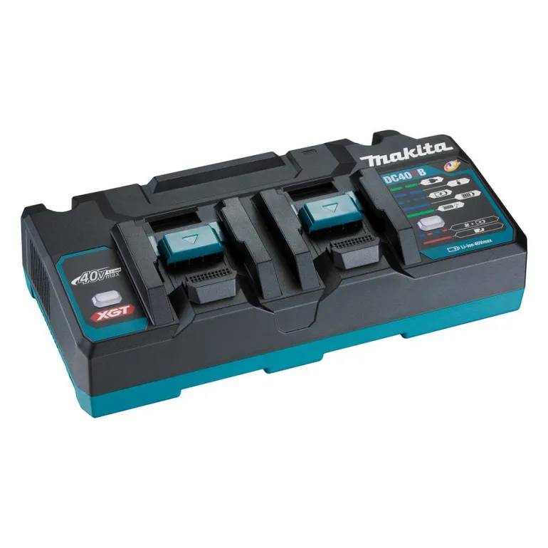 Kahden akun tuplalatauslaite 40V XGT® -akuille. Kaksi erillistä tuuletinta jäähdyttää akkua ja latauslaitetta erikseen, mikä mahdollistaa nopeamman latauksen.