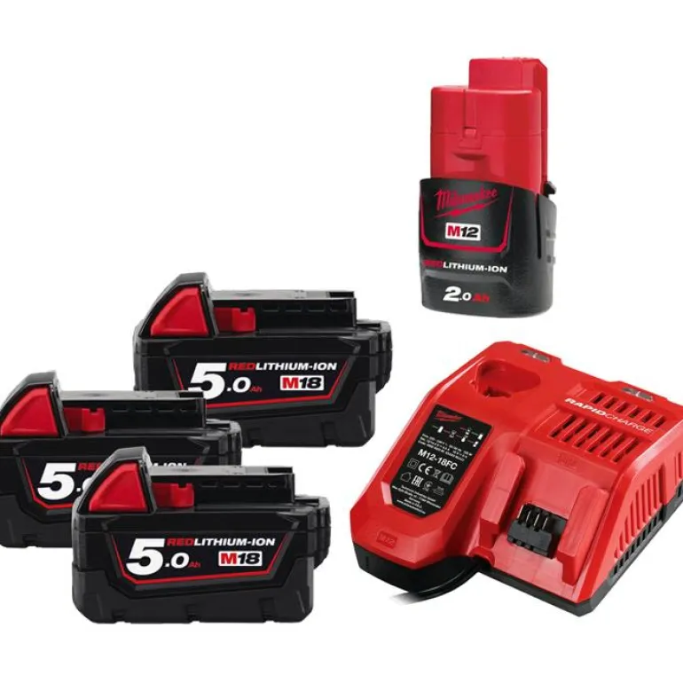 Milwaukee-laturipaketti, joka sisältää 3 kpl 18 V:n ja 5,0 Ah:n Li-ion-akkuja ja pikalaturin M12-18 FC.