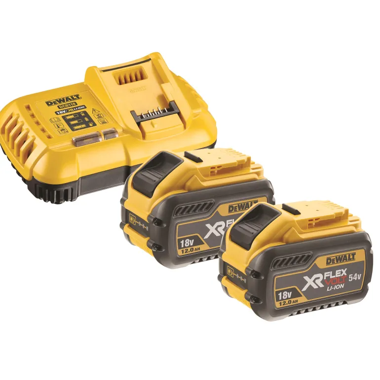 Dewalt DCB118Y2T-QW on 54/18V-akkualoituspaketti, jossa on pikalaturi ja kaksi akkua. Pikalaturi tuottaa 8 A, ja akkujen kapasiteetti on 4 Ah tai 12 Ah (4 Ah 54 V:n koneilla, 12 Ah 18 V:n koneilla).