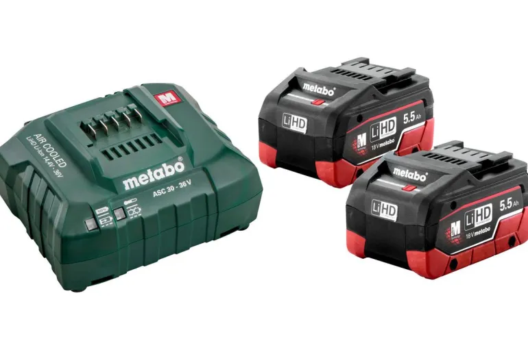 Metabon akkupaketti sisältäen 2 kappaletta 18 V/5,5 Ah LiHD-akkuja ja ASC 145-pikalaturin.