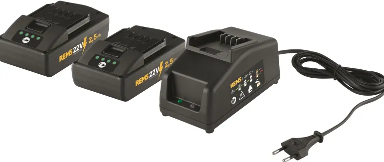 Latauspaketti ”Power-Pack” sisältää 2 x 21,6 V 2,5Ah -akkua REMS 22V Technology -koneisiin sekä laturin.