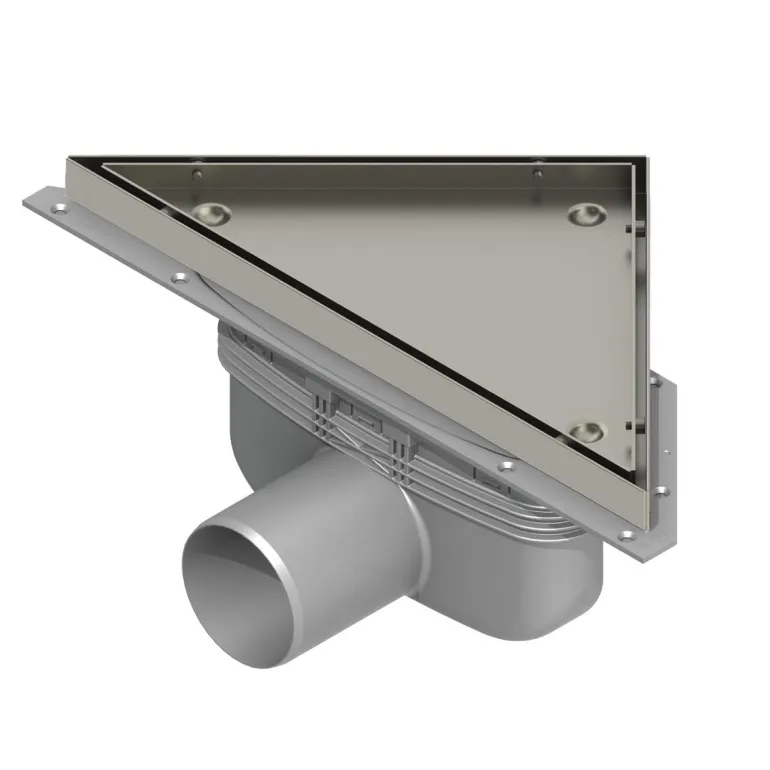 Lattiakaivo asennettavaksi kulmiin, mukana viemärikaivon kehys ja siivilä sekä kiinnitys betoni- ja puulattioille. Koko 75 mm.