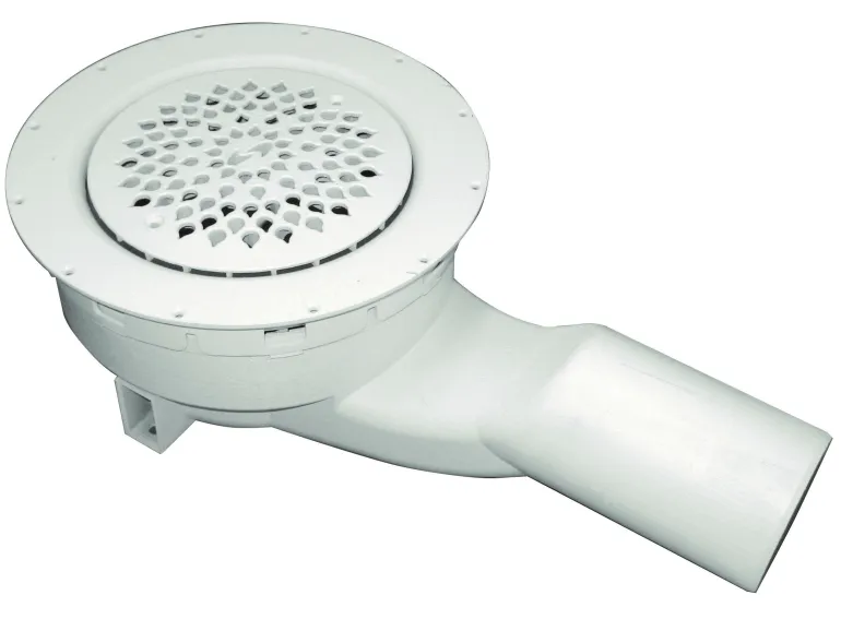 Lattiakaivo siivilällä, kiristysrenkaalla ja irrotettavalla vesilukolla. Vaakasuuntaisella ulostulolla ja kiinnityskorvakkeilla Purus-tuen kiinnittämistä varten. PP-muovia, halkaisija 40 mm.
