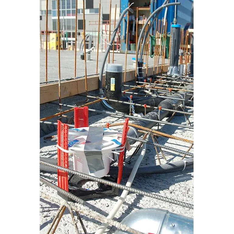 Lattiakaivoteline, jota käytetään lattiakaivojen asentamiseen ja keskittämiseen betonirakenteisiin. Teline täyttää alan määräysten mukaiset vaatimukset turvallisesta vesiasennuksesta lattiakaivon tarkkaan kiinnitykseen oikealla korkeudella ja tasolla, kun se on upotettu betonirakenteisiin. Teline koostuu pohjalevystä, 3 säätöjalasta ja kiinnityshihnasta.
