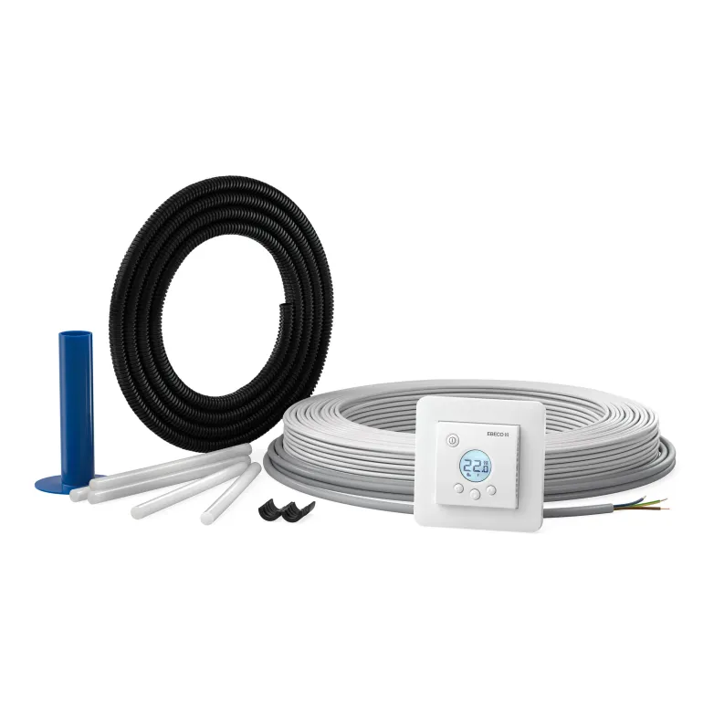 Lattialämmityssarja, joka sisältää 8,9 m lämpökaapelia, jonka lämmitysteho on 11 W/m, termostaatin, jossa on kaksi energiaa säästävää ohjelmaa, kätevän kelanpitimen, kierreletkun, teippiä ja liimapuikot.