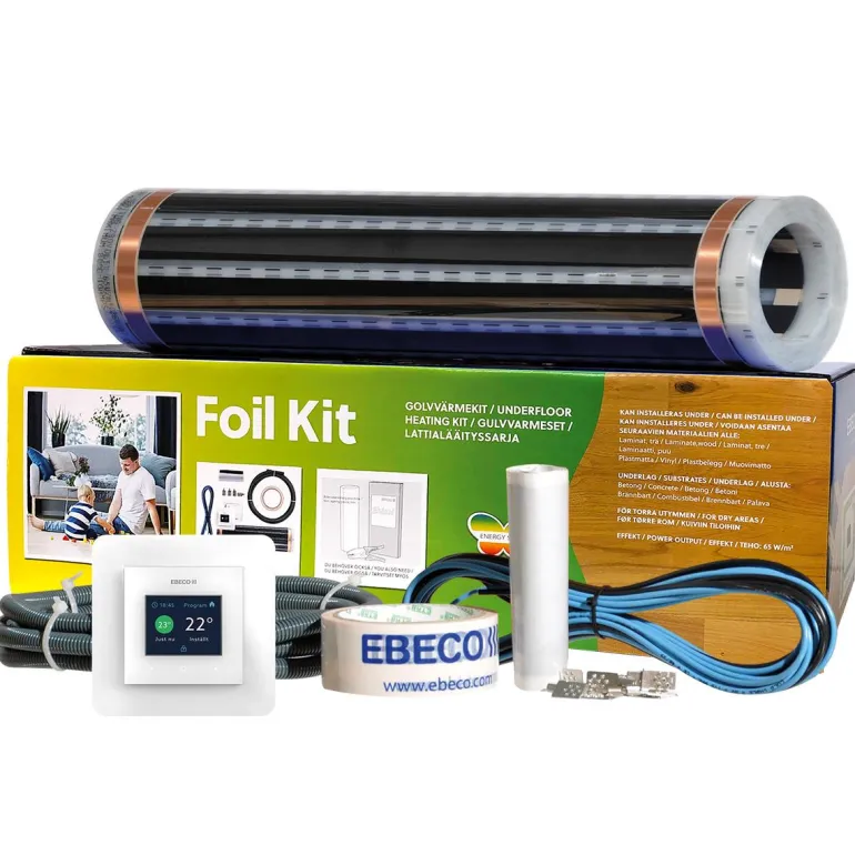 Ebeco Foil Kit 500 on lattialämmityssarja jopa 12 m²:lle, sopii puulle ja laminaatille. Foil Kit 500 -sarjan ansiosta lattialämmitys on helppo saada sekä puulattioiden, laminaattien että muovimattojen alle. Lattialämmityskalvo on kestävä, luotettava ja erittäin ohut – vain 0,3 mm. Se ei sisällä halogeenia eikä PVC:tä.