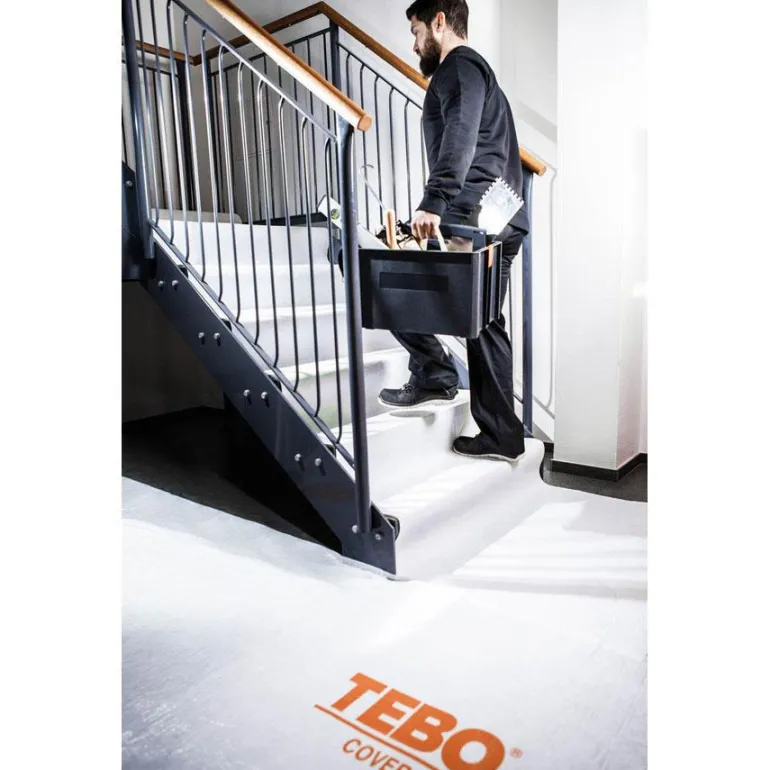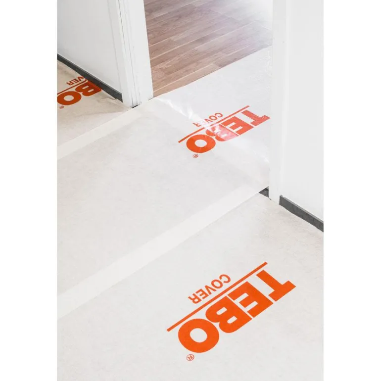 TEBO-kansi 776780 on Nonwoven-kankainen lattiansuojain, jossa on vesitiivis PE-kalvopäällyste. Alapuoli on liukumaton ja antaa hyvän pidon tarttumatta alustaan. Suojain soveltuu käytettäväksi esimerkiksi peruskorjauksessa, maalauksessa tai laatoituksessa Lattiasuojaimen leveys sopii oviaukkoihin ja portaisiin. Suojain rullataan ulos niin, että 10 cm menee päällekkäin, ja se voidaan rullata ja käyttää uudelleen käytön jälkeen.