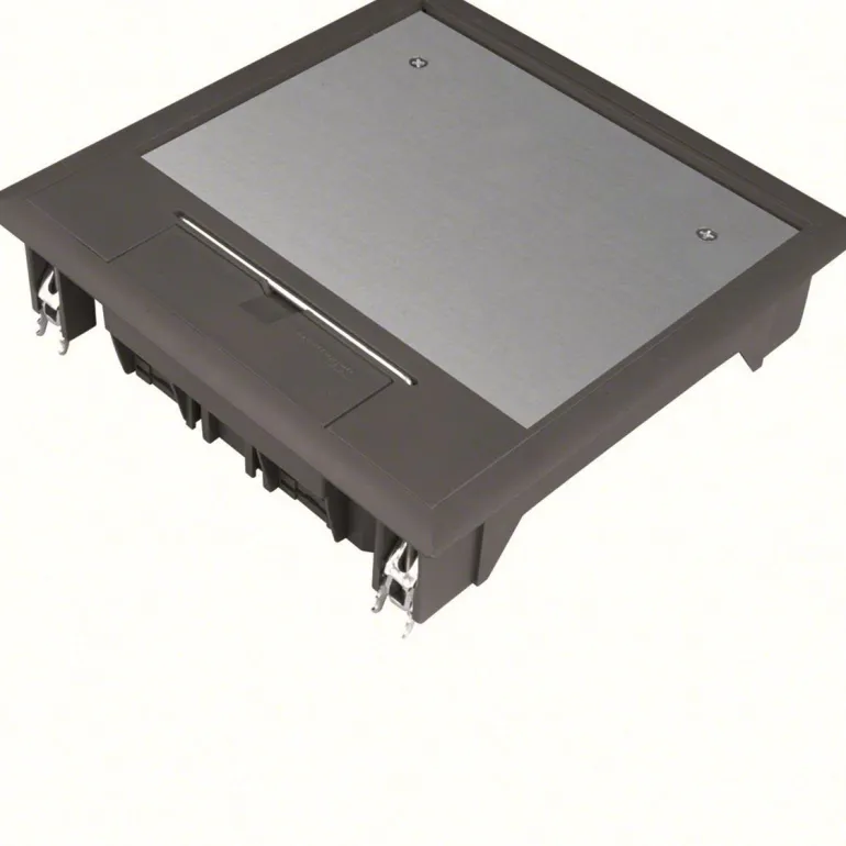 Lattiarasiakansi Q06 200×200 mm 5 mm lattiapinnoitteelle polyamidi-muovista, syvänmusta. Lattiarasiakansi DIN EN 50085-1 ja DIN 50085-2-2 mukaan. Suojamaadoitettujen pistorasioiden määrä 6.