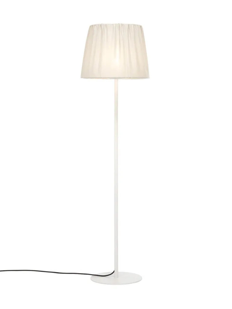 Agnar-lattiavalaisin ulkokäyttöön. Lampunvarjostin on valmistettu 100% akryylidralonista valmistetusta kankaasta, joka kestää hyvin sääolosuhteita. Meleerattu kangas (OEKO-TEX® Standard 100 -sertifioitu) korkealla valonkestävyydellä (5–7) ja vettä ja likaa hylkivällä teflonkäsittelyllä. Varjostimen teline on sinkitty ruostumisen ehkäisemiseksi. Valaisimessa E27-kanta, ja suositeltu valonlähde on 1806404 (PR Home). Valonlähteen ja lampun kannan päällä on valkoinen muovikansi ja tiiviste, jotka suojaavat kosteudelta. Varjostin kiinnitetään jalkaan erikoiskiinnikkeellä. Jalka ja varjostin myydään vain settinä.