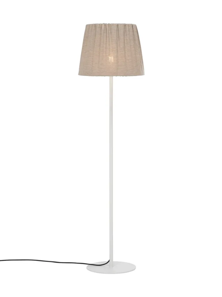 Agnar-lattiavalaisin ulkokäyttöön. Lampunvarjostin on valmistettu 100% akryylidralonista valmistetusta kankaasta, joka kestää hyvin sääolosuhteita. Meleerattu kangas (OEKO-TEX® Standard 100 -sertifioitu) korkealla valonkestävyydellä (5–7) ja vettä ja likaa hylkivällä teflonkäsittelyllä. Varjostimen teline on sinkitty ruostumisen ehkäisemiseksi. Valaisimessa E27-kanta, ja suositeltu valonlähde on 1806404 (PR Home). Valonlähteen ja lampun kannan päällä on valkoinen muovikansi ja tiiviste, jotka suojaavat kosteudelta. Varjostin kiinnitetään jalkaan erikoiskiinnikkeellä. Jalka ja varjostin myydään vain settinä.